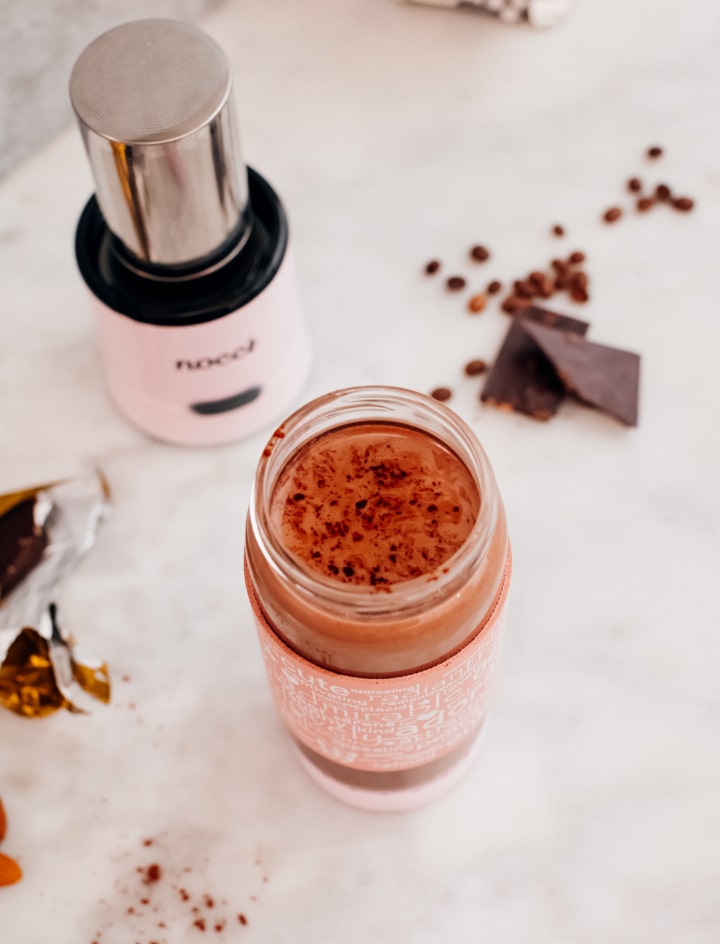 Fill cup (around 10-12oz) with cold or warm water (use the Nocci belly band if using hot water so to safely hold the glass). Blend until smooth and enjoy in a warm mug or pour over a cup of ice!